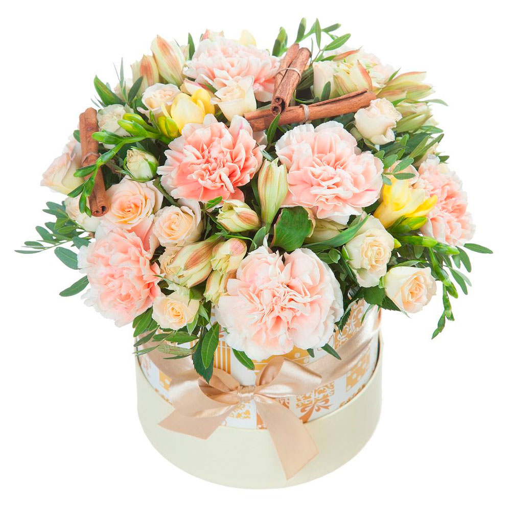 На фото представлен образец. Объем коробки зависит от выбранного вами размера. Точное количество цветов и цветовую гамму вы можете уточнить у менеджера по телефону.